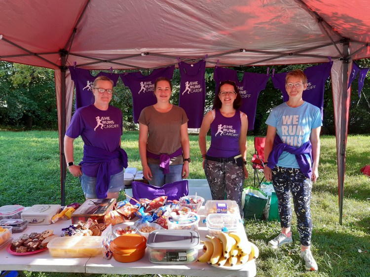 When Mark announced that he was going to run the VOGUM on 27th August 2021 I was fairly confident that I could recruit a couple of volunteers to run a checkpoint with me from the fabulous She Runs: Cardiff community. Within 24 hours of putting a message on Facebook I was thrilled that 12 volunteers had put themselves forward, which threw up the problem that the checkpoint might get too crowded. The solution was to have two shifts so everyone could try the experience. Planning the shifts the nerves kicked in, as the responsibility of coordinating the people, food, drink equipment, and manpower for a checkpoint for Pegasus’ biggest event ever (with 180 sign ups) hit me. Really, I needn’t have worried, with just a 5 minute briefing the SR:C ladies came up trumps and managed all the inevitable minor problems as they happened with ease. The early crew were having such a great time they didn’t want to leave at the allotted time but again, I need not have worried. They worked so well as a team that at no point did the checkpoint seem crowded. As runners came through, they were greeted with cheers, enthusiasm, cake and fruit. It was lovely when runners from the SR:C group arrived, creating a fabulous party atmosphere. Once the checkpoint had been packed up and delivered to the finish, I grinned as I overheard two finishers contemplating running back for more cake.